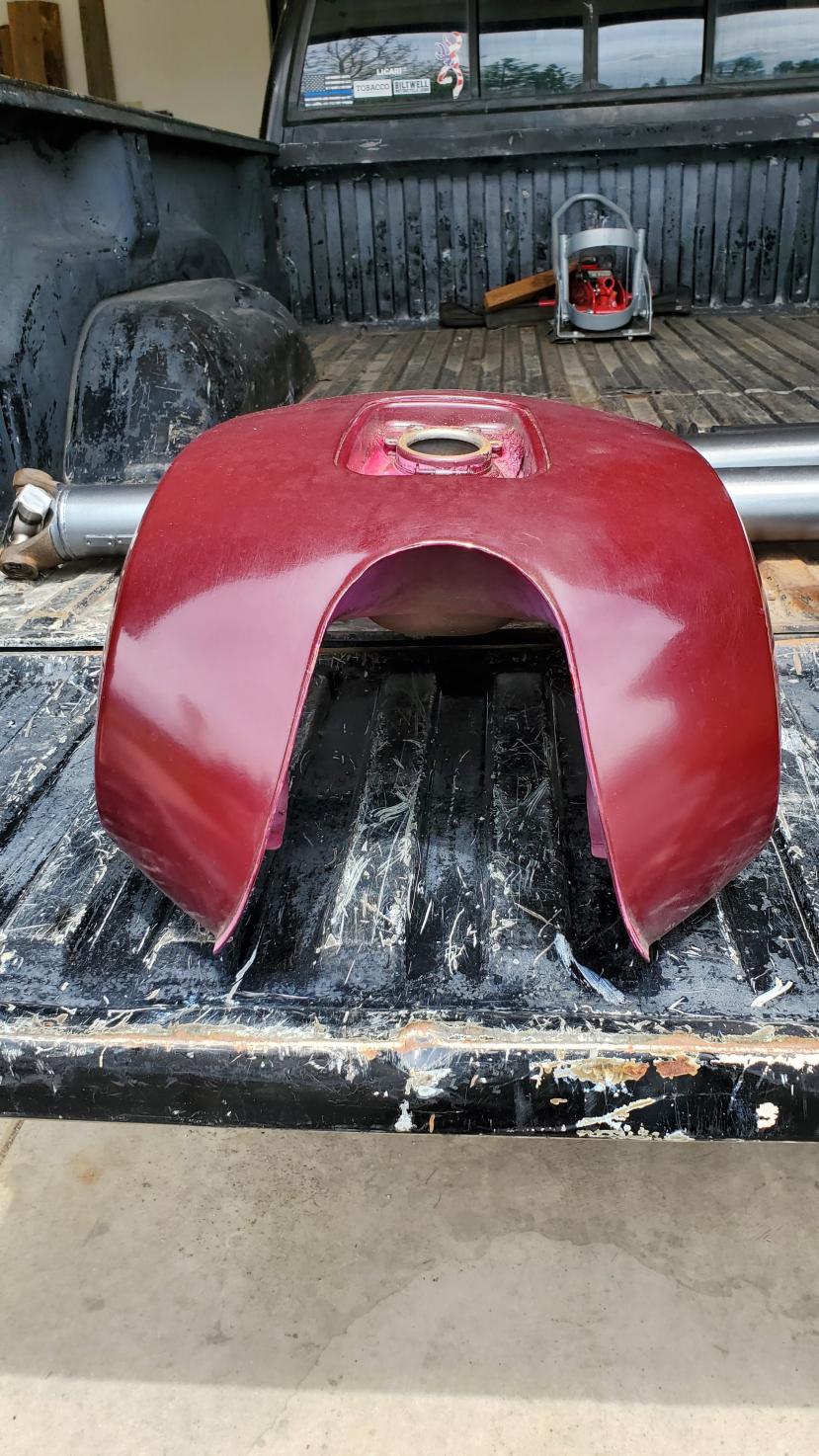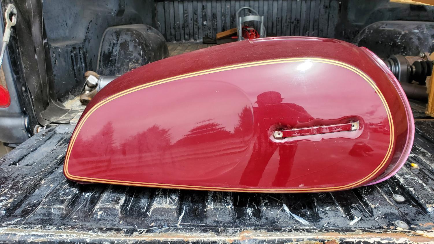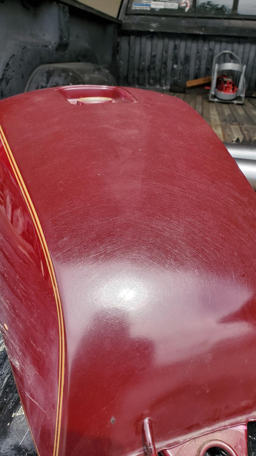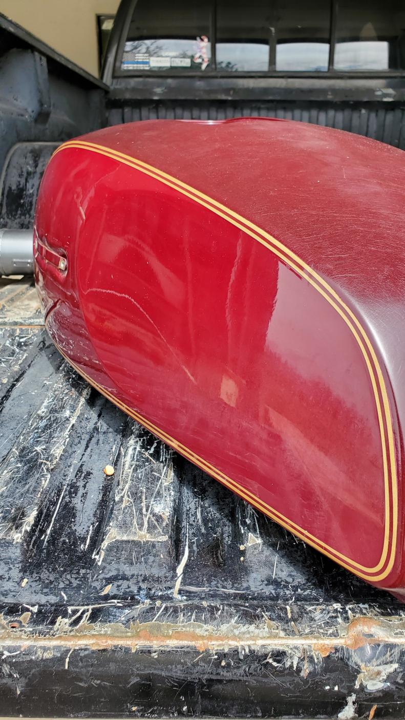 To bad it's paint is damaged, unable to restore original color. I have a NOS tank never put on a bike still with original coverings on opening has been painted maroon, not Macho Maroon, I have never found anyone who could duplicate color. Just to paint a tank right is $300.