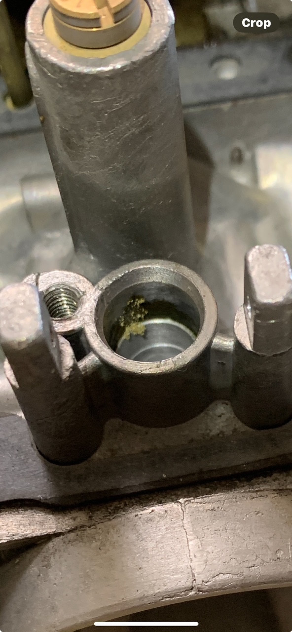 Cajun, as it stands I did EXAMINE the pilot jets and they looked ok-to me-could see though 'em; put 'em back in. I polished the seats with some Mother's mag cream as suggested and my little dremel buffers. I also ( pic below ) found some crusty residue ( don't know what else to call it ) in the hole where the assembly sits. Weird. Scraped it off with an exacto...CAREFULLY. Reinstalled assemblies with new o-rings and gaskets.