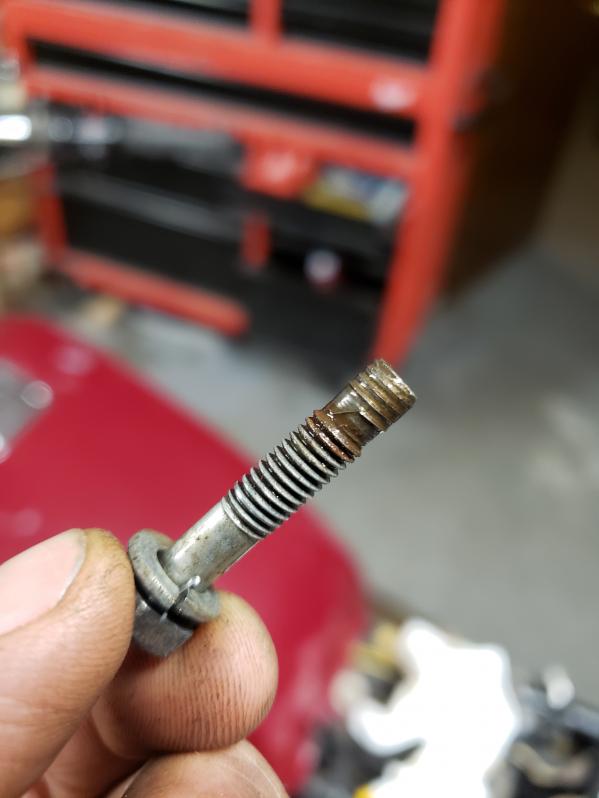This seemed to be it, plus a few shot rows of bolt thread - didn't even torque it that hard, thinking PO might've? Anyway for anyone that has this problem: I got a long flathead through a Very narrow gap underneath the housing and levered up the bottom of the bolt while ratcheting (did I mention I nabbed a flea market compressor ) and all of a sudden the bolt was fighting a bit, then backed out! Tray has seen better days but it's salvageable. Bax's suggestion didn't pan out exactly but it got me in the right direction, muchas gracias! Click image for larger version