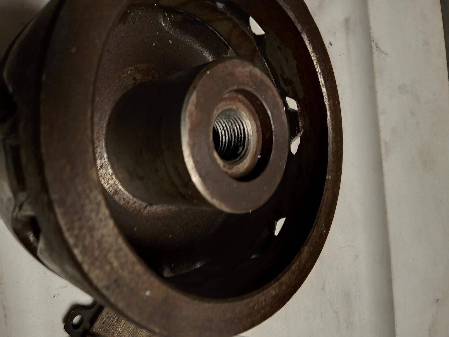 As for removing the rotor, first remove the bolt that holds the rotor on. Then take the 16mm bolt and thread it into the threads on the rotor. Put a little oil on the threads first. Tighten the bolt down until the rotor pops off. When re-installing the rotor, just tighten it down to spec (47 ft-lb) with the original bolt.