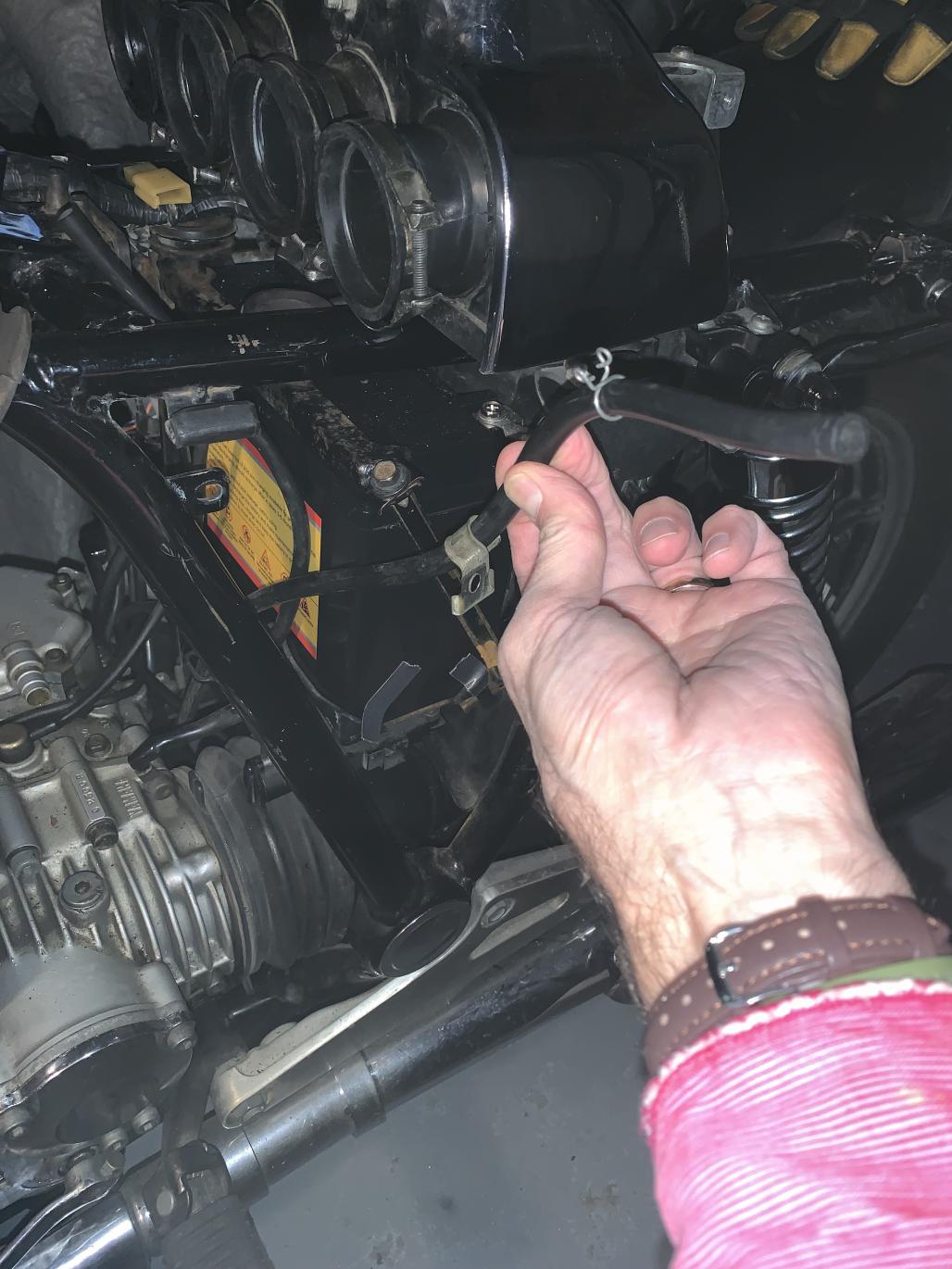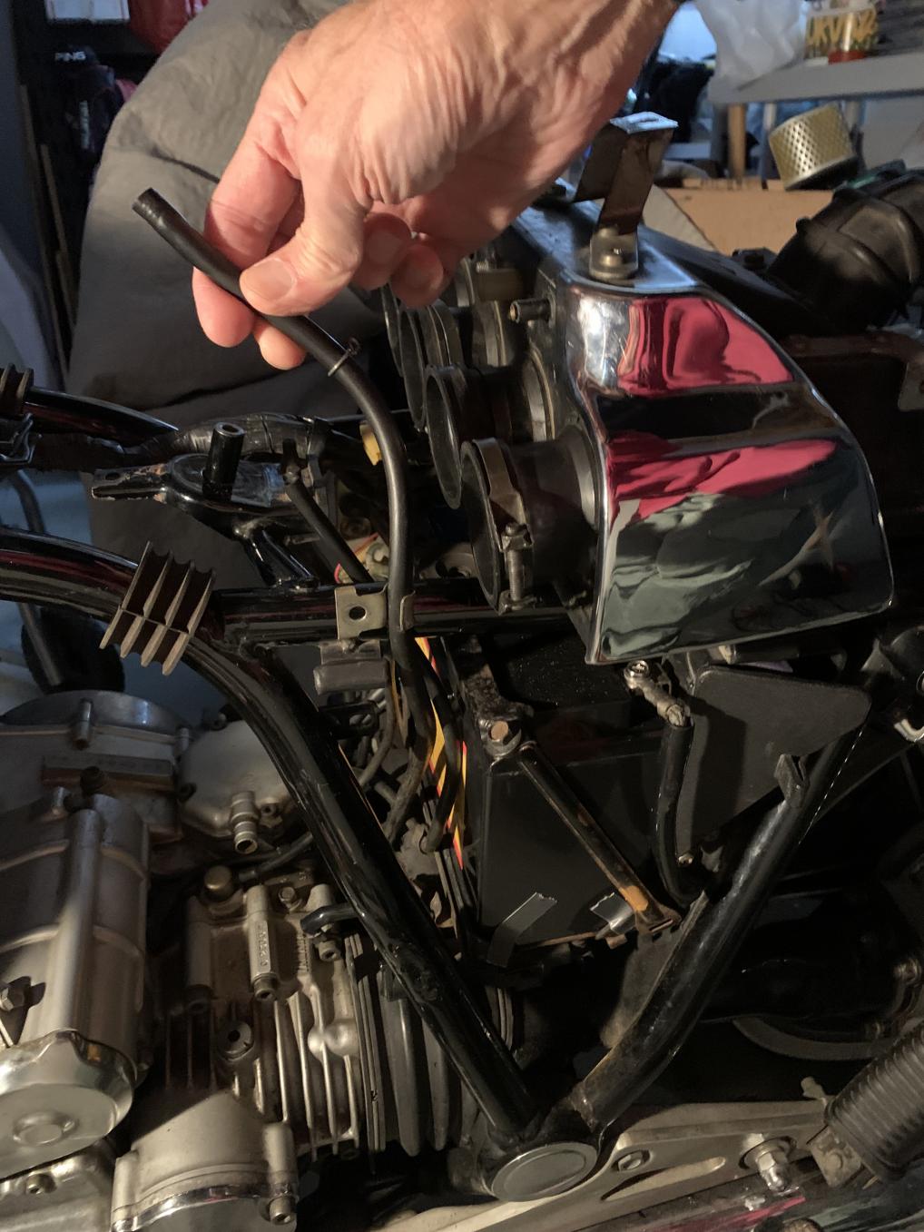 Hi again all, I used to know this stuff when I first got the XS (79F), but have forgotten some of it . To what does this hose connect to, and where and how, please. I have the Clymer manual, and have searched the forum, but I'm still unsure. The pics are all the same hose. It routes to bottom of frame through a little guard. Thank you!