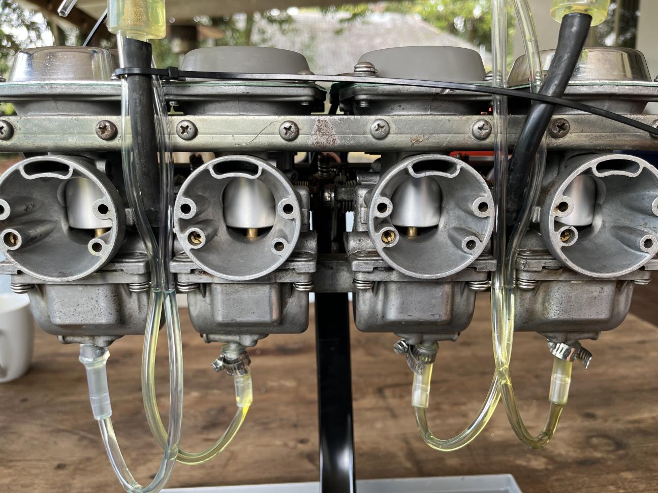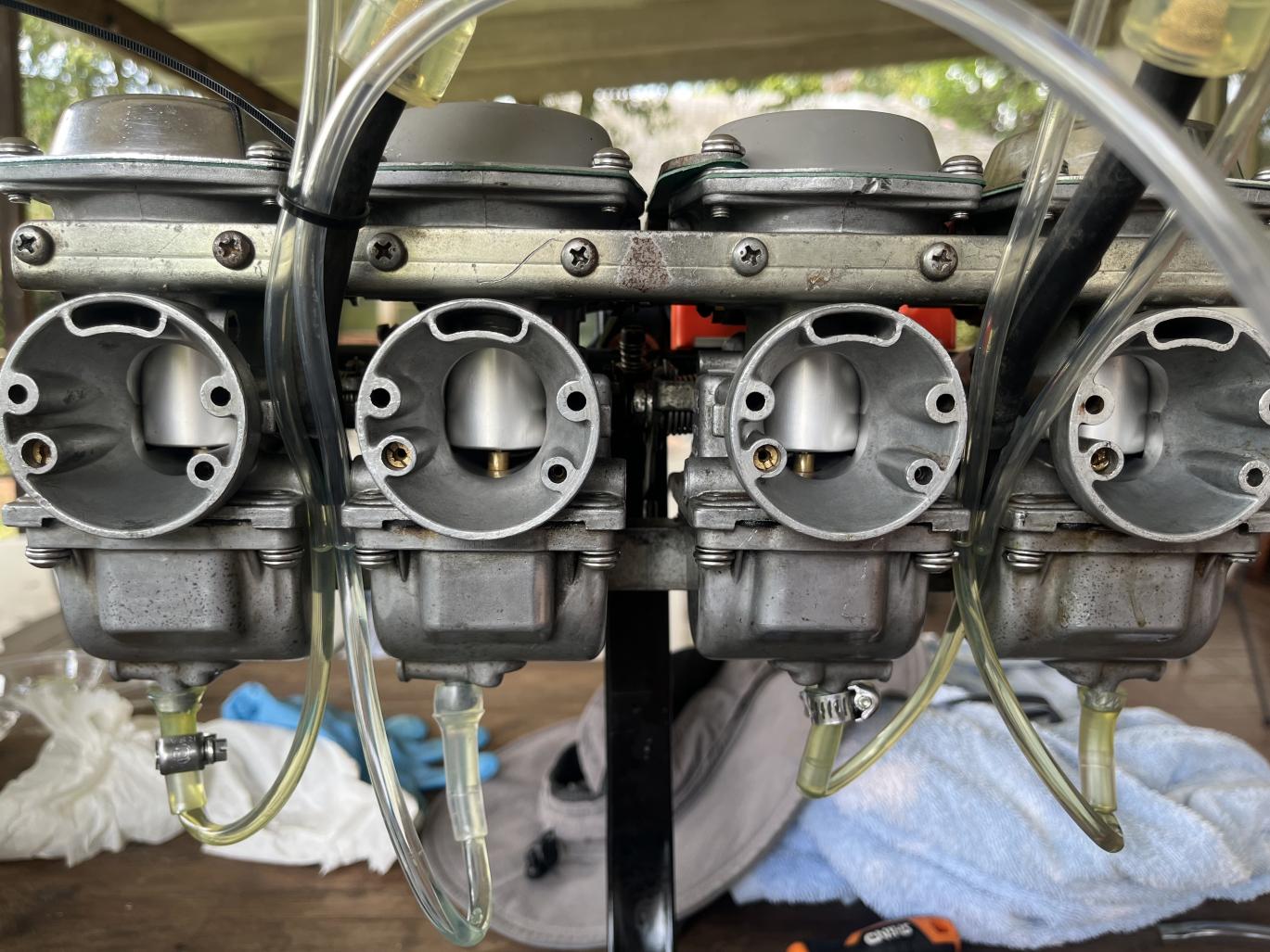 I did notice that in the upside down position my floats were all higher than the 25mm service manual measurement. I adjusted them all closer to spec and checked the float levels with the bowls back on….which are all about equal but higher now than before.