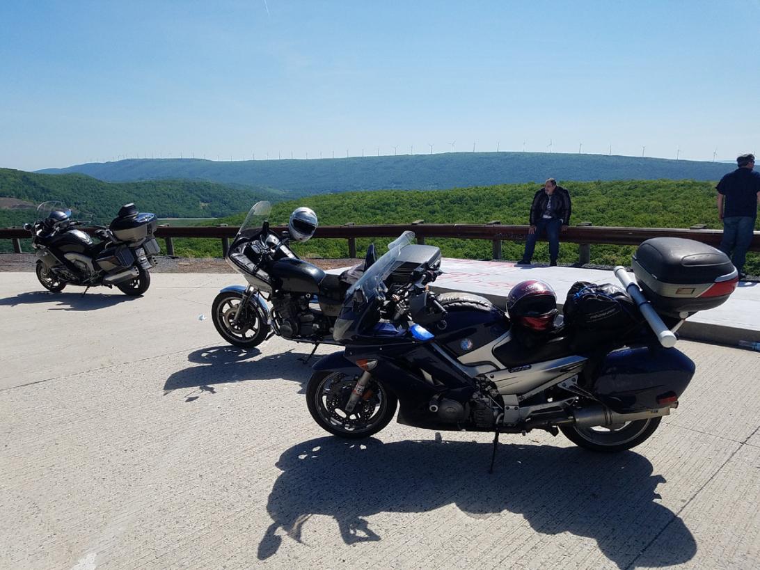 Ready to ride, five bikes, 60% are XS11s. Kickstands up at 0920. Rain gear questionable. US-33 eastbound to Seneca Rocks is a superslab but necks down to 2 lanes for some sweeping turns. We arrived at Seneca Rocks for a look see then south on US-33/SR-28 to Judy’s Gap. Enroute we encountered a deer in the road, another in the bush on the far side. I beeped my horn prompting the one deer to climb the right side while on the left the other deer pushed through the bush.
